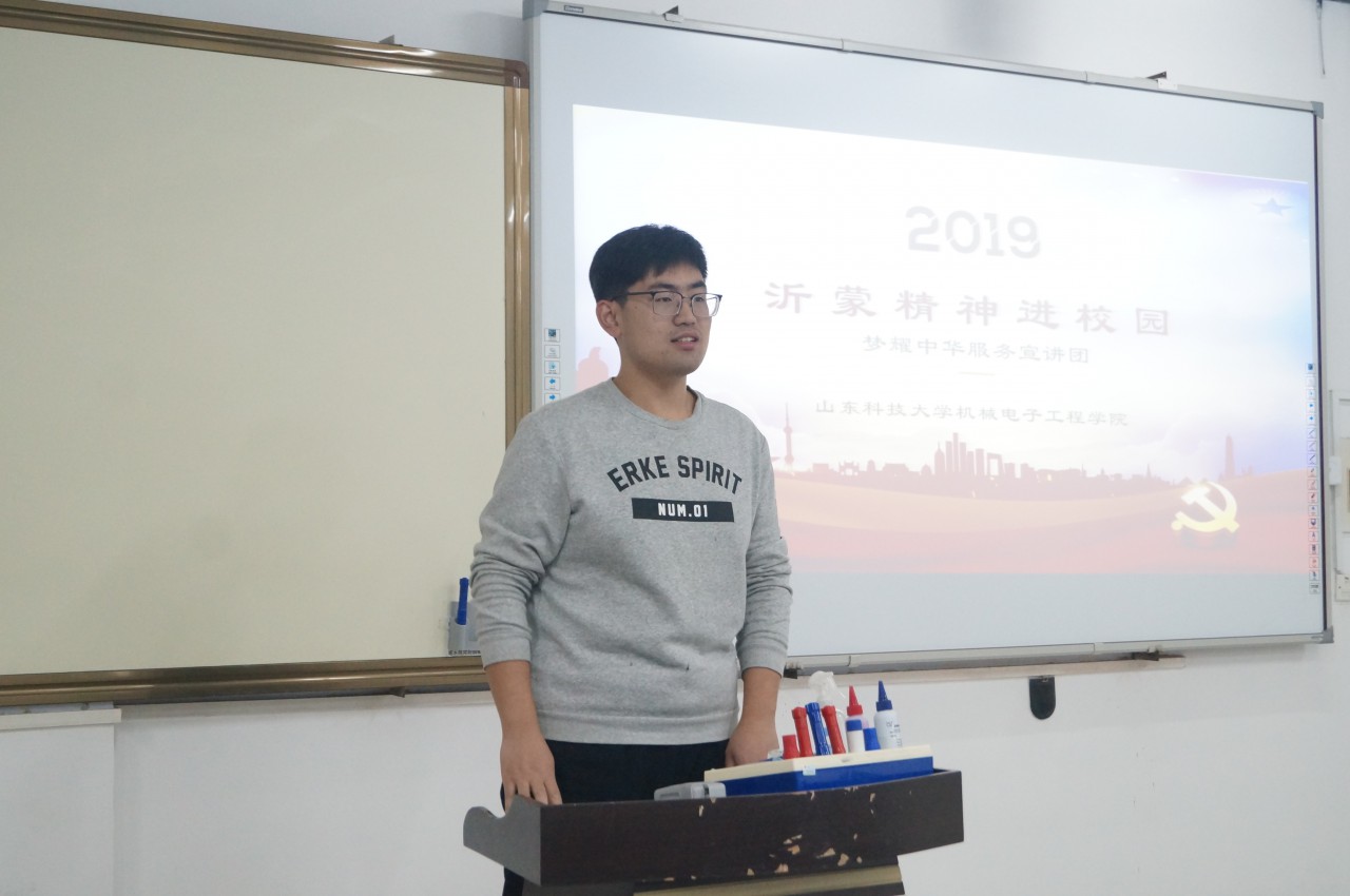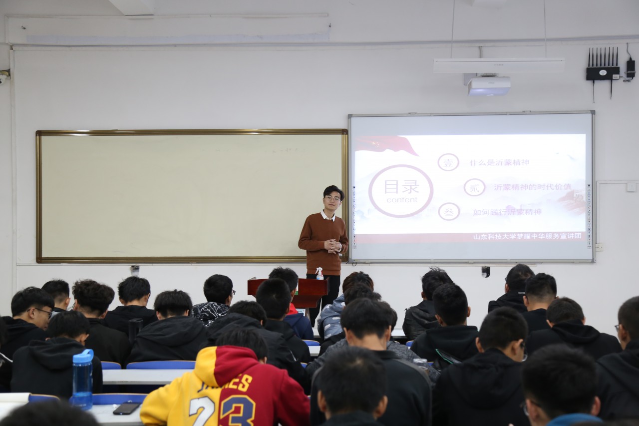 宣讲从“沂蒙精神”的内涵和发展历程、“沂蒙精神”的当代价值、新时代大学生应当如何践行“沂蒙精神”三方面展开,并结合《力量》纪录片等影视作品,直观生动地带领广大同学,深入了解了沂蒙精神“水乳交融、生死与共”的具体内涵。宣讲团成员提出,前辈们为我们的解放事业奉献了一切、牺牲了一切,我们要倍加珍惜今天的幸福生活,努力弘扬、践行沂蒙精神。梦耀中华服务宣讲团骨干成员还分享了他们在沂蒙地区的实践经历和实践故事,讲述了社会实践的感受和切身体验到的沂蒙精神,使同学们收益颇丰。