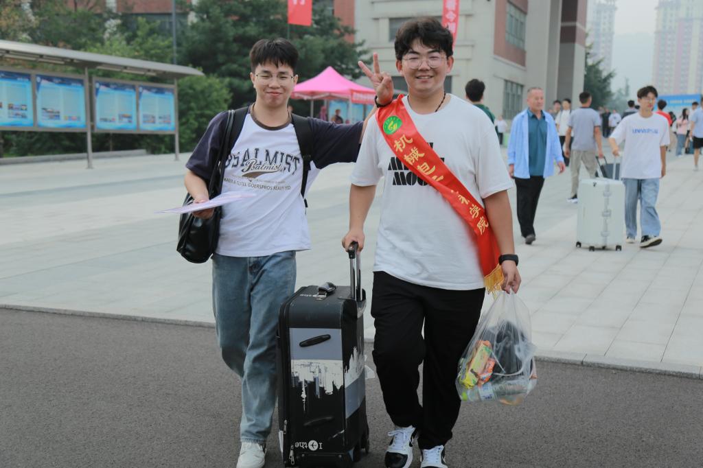“行李交给我们来拿吧”“这是咱们学院宿舍楼,里面有直饮水机和淋浴间”“你以后有什么问题随时和我联系”,远处相迎、指引带路、后勤保障,初见即如故,一句句温暖的话语迅速拉近了新生与机电的距离。志愿者们贴心的服务和悉心的帮助给新生们留下了美好的“机电第一印象”。