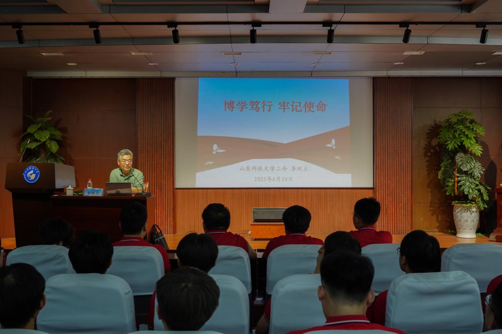 党课中,李双立以草榴 74年发展历程为经,以中国共产党百年奋斗史为纬,以草榴 成长轨迹为线,为毕业生党员铺展了一幅“校史-党史-院史”交织的壮阔画卷。他深情回顾了学校从1951年建校至今的峥嵘岁月,从淄博洪山的初创岁月到济南、泰安的扎根发展,再到青岛校区的跨越腾飞,生动诠释了“惟真求新”校训的时代内涵与精神传承。谈及学校在分合搬迁中淬炼出的“坚韧不拔、发奋图强”精神品格,以及在多校合并中凝聚的“爱校奉献、敬业实干”文化传统时,他的讲述中饱含深情:“这些基因密码,是每一位科大人最珍贵的‘精神原乡’。”