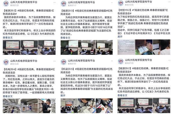 在阅读红色经典书籍活动中,各班级分别通过团日活动或主题班会等形式扎实开展,其中,机电20-6班的同学们在班长和团支书的带领下来到图书馆,借阅红色读物,营造出浓厚的读书氛围;能源20-3班组织分享《长征》《可爱的中国》《党旗颂》等书籍,围绕习近平新时代中国特色社会主义思想畅谈读书感悟;智造20-3班组织同学阅读分享《毛泽东选集》《共产党宣言》等书,感受马克思主义与中国革命和建设实践相结合的深厚力量;机电20-5班阅读《强国之路》等书,深刻感受在中国共产党领导下伟大的发展历程……活动过程中,同学们深刻理解、阅读,积极推荐、分享,畅谈读书感悟,形成阅读笔记,充分将爱国之情和报国情怀紧密结合。
