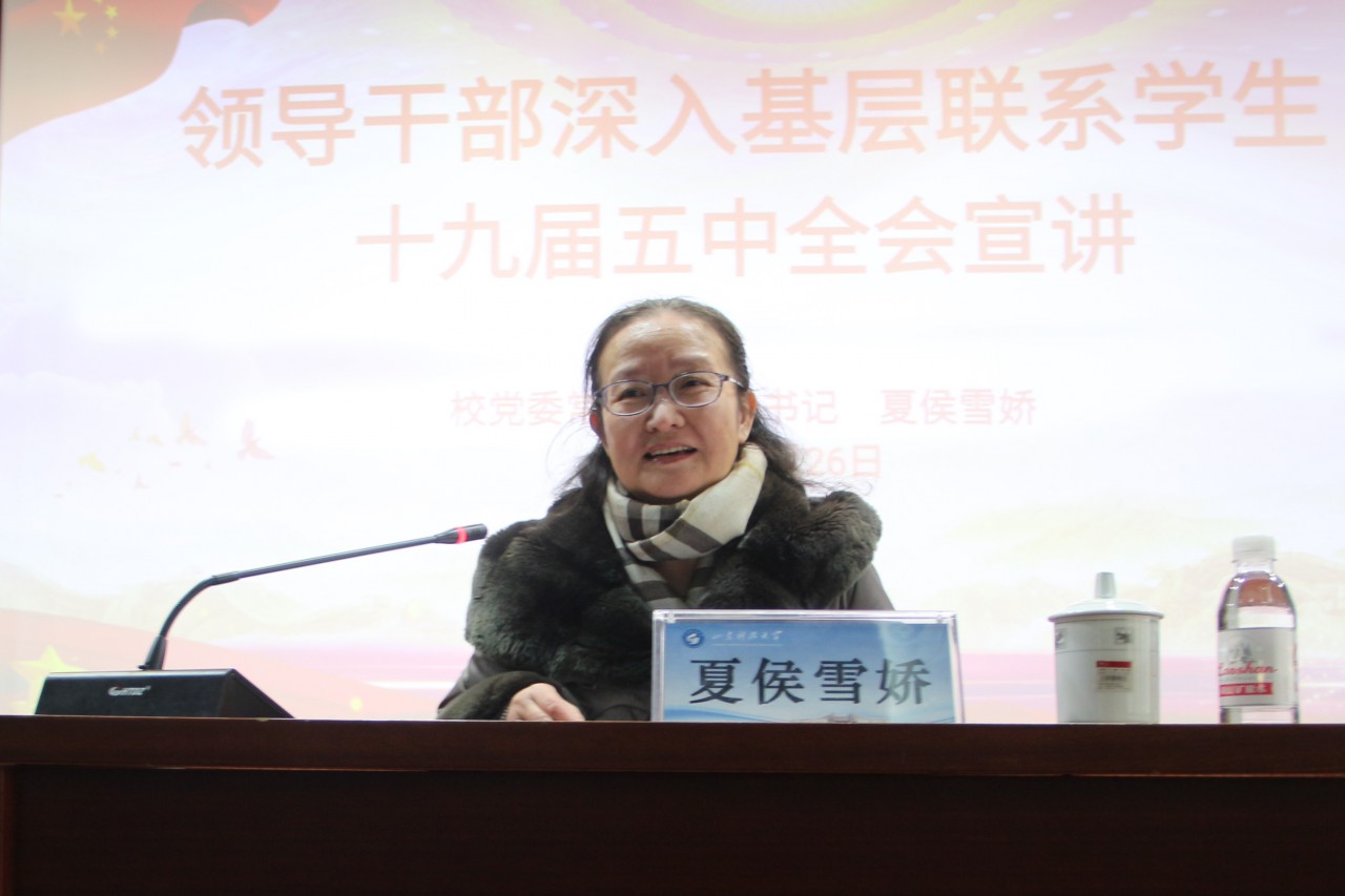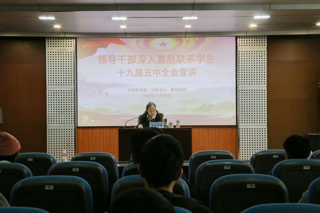 点击:为深入贯彻党的十九届五中全会精神,落实学校领导干部深入基层联系学生工作要求,11月26日下午,校党委常委、纪委书记夏侯雪娇在草榴 报告厅向机械设计制造及其自动化专业2019-2班学生宣讲党的十九届五中全会精神。草榴 党委书记韩宝坤,党委副书记、副院长陈猛出席,机械设计制造及其自动化专业2019-2班全体学生参加。 夏侯雪娇紧扣党的十九届五中全会主题,为同学们详细讲解了《中国共产党第十九届中央委员会第五次全体会议公报》和习近平关于《中共中央关于制定国民经济和社会发展第十四个五年规划和二〇三五年远景目标的建议》等重要文件,对党的十九届五中全会精神进行了深入解读。围绕党和国家事业取得的历史性成就和改革发展大势,她介绍了我国近几年来在国家发展、社会治理等方面取得的巨大成就,2035年远景目标和“十四五”时期我国发展的指导方向、主要目标、重点任务,引发同学们的强烈共鸣。 夏侯雪娇勉励同学们,当今世界正经历百年未有之大变局,作为千禧之年出生的新时代青年,要做变局中的引领者,而不是适应者,希望同学们时刻牢记总书记的嘱托,胸怀报效祖国的抱负,重视培养对知识的建构,为跻身创新型国家前列、实现科技强国贡献自己的青春力量。 本次领导干部深入基层联系学生工作,体现了学校对青年学生思想动态的关注,引领同学们深入学习党的最新政策方针,激发了广大学生的爱国热情,引导同学们学习领会党的十九届五中全会精神,提高自身修养,与时代同呼吸,与祖国共命运。(通讯员:祝月盈 林范运 摄影:孙建华)