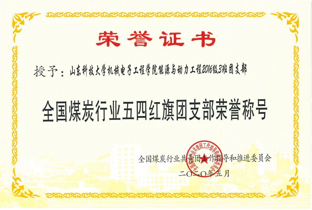 日前,全国煤炭行业共青团工作指导和推进委员会对2019年度全国煤炭行业优秀团委(团支部)、团干部和共青团员进行了表彰,草榴 草榴 能源与动力工程2016级3班团支部荣获“全国煤炭行业五四红旗团支部”称号。