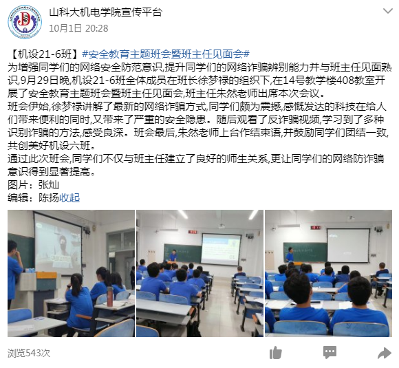 研究生开展安全教育主题班会 各班级通过多种形式的主题班会,引导同学们注册“国家反诈中心官方APP”、“反诈云盾”等安全软件,并通过学习大学生防范网络诈骗与非法集资学习资料、签署《主动学习反诈知识 拒绝电信网络诈骗》倡议书等多种途径,切实增强了草榴 学生安全防范意识和避险能力,而且对保障同学们的人身财产安全具有重要意义。