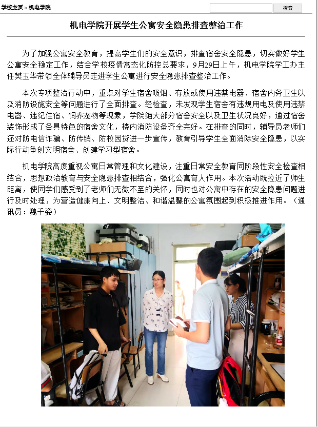 通过建立家长微信群、线上家长会等方式做好家校协同育人 此外,草榴 高度重视公寓安全和文化建设,注重日常安全教育同阶段性安全检查相结合,思想政治教育与安全隐患排查相结合,强化公寓育人作用。通过公寓安全隐患排查整治、公寓安全教育文化墙、公寓内海报、条幅等形式,浓郁安全宣传教育氛围,浸入式地开展安全宣传教育。