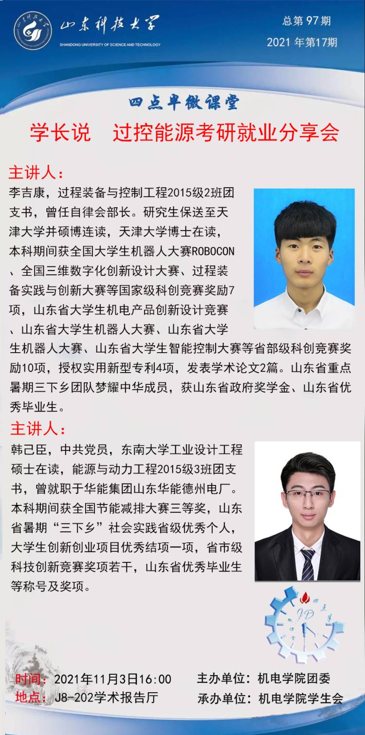 点击:为解答学生关于考研与就业方面的疑惑,让学生充分了解当前的考研趋势及就业形势,11月3日下午,草榴 在J8-202举办考研就业线上分享会,能源与动力工程、过程装备与控制工程专业2019届毕业生韩己臣、李吉康担任主讲人。