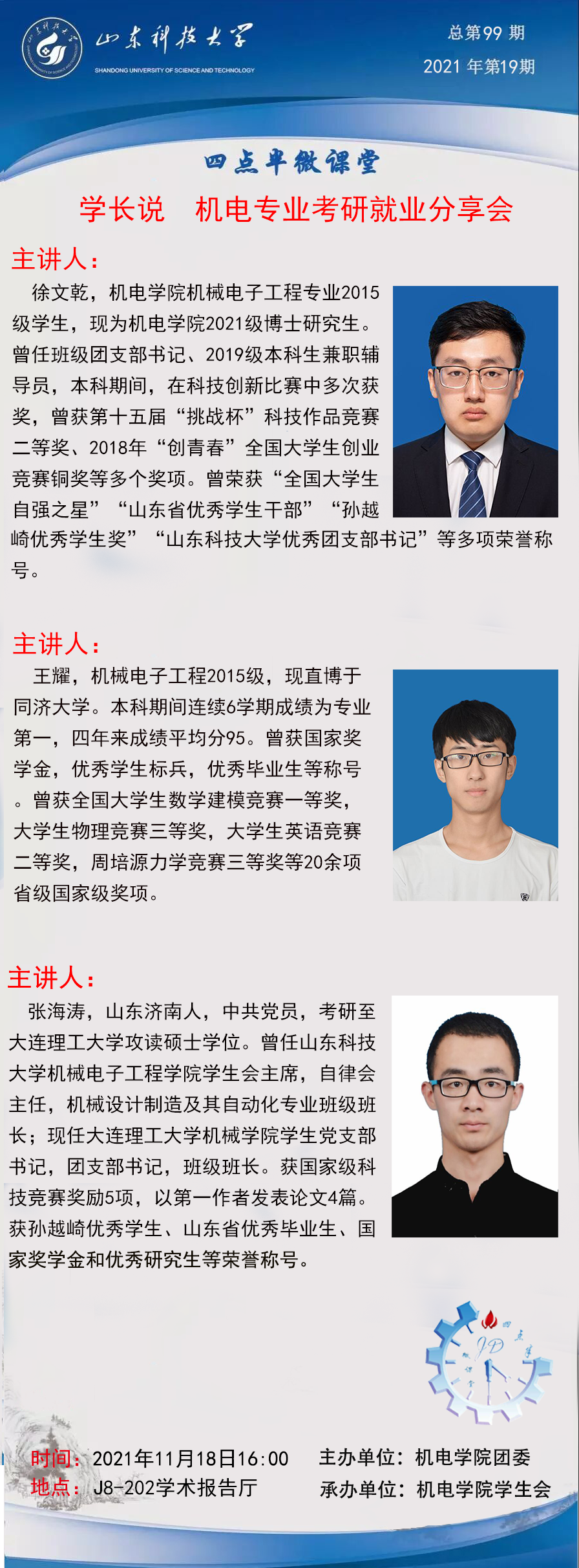 点击:为了让同学们了解当前考研与就业情况,给机电学子提供经验和建议,11月18日下午,草榴 在学院报告厅举办“机电专业考研就业”线上分享会,机械电子工程、机械设计制造及其自动化专业2019届毕业生王耀、徐文乾、张海涛担任主讲人。