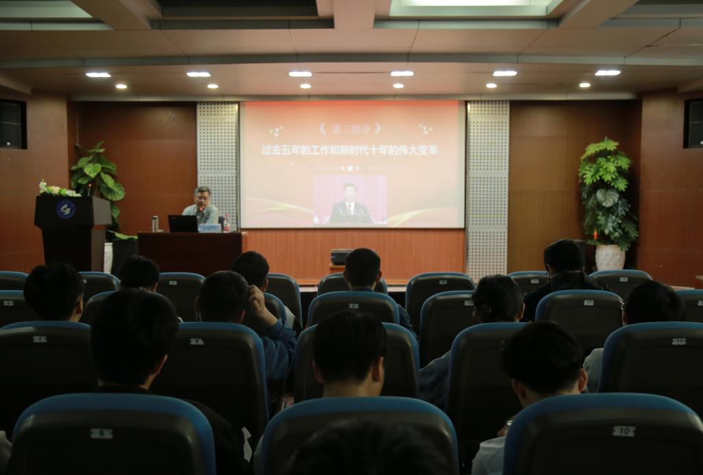 纵观历史长河,横览国际发展。李双立书记先从“九个深刻领会”和“七个讲清楚”出发,向学生们简要讲述了党的二十大精神内涵。他整体解读,又突出重点,结合自身经历,将党的二十大精神分为了九个部分传达给青年学子。