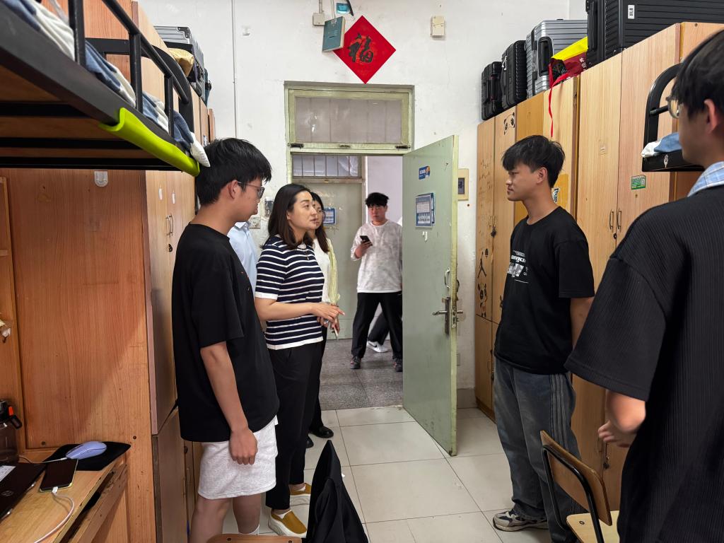 检查过程中,刘梅月督促辅导员提醒各年级学生落实常态化通风消毒措施,强化饮食健康管理。在走访毕业生宿舍时,她认真了解学生考研就业进展、毕业设计完成情况,鼓励毕业生做好规划;面对低年级学生,她细致了解学业适应状况与思想动态,暖心叮嘱:“有困难随时找辅导员,草榴 永远是你们的坚强后盾。”同时,她对辅导员队伍提出明确要求,通过强化日常走访与深度关怀机制,将学生工作做深做实。