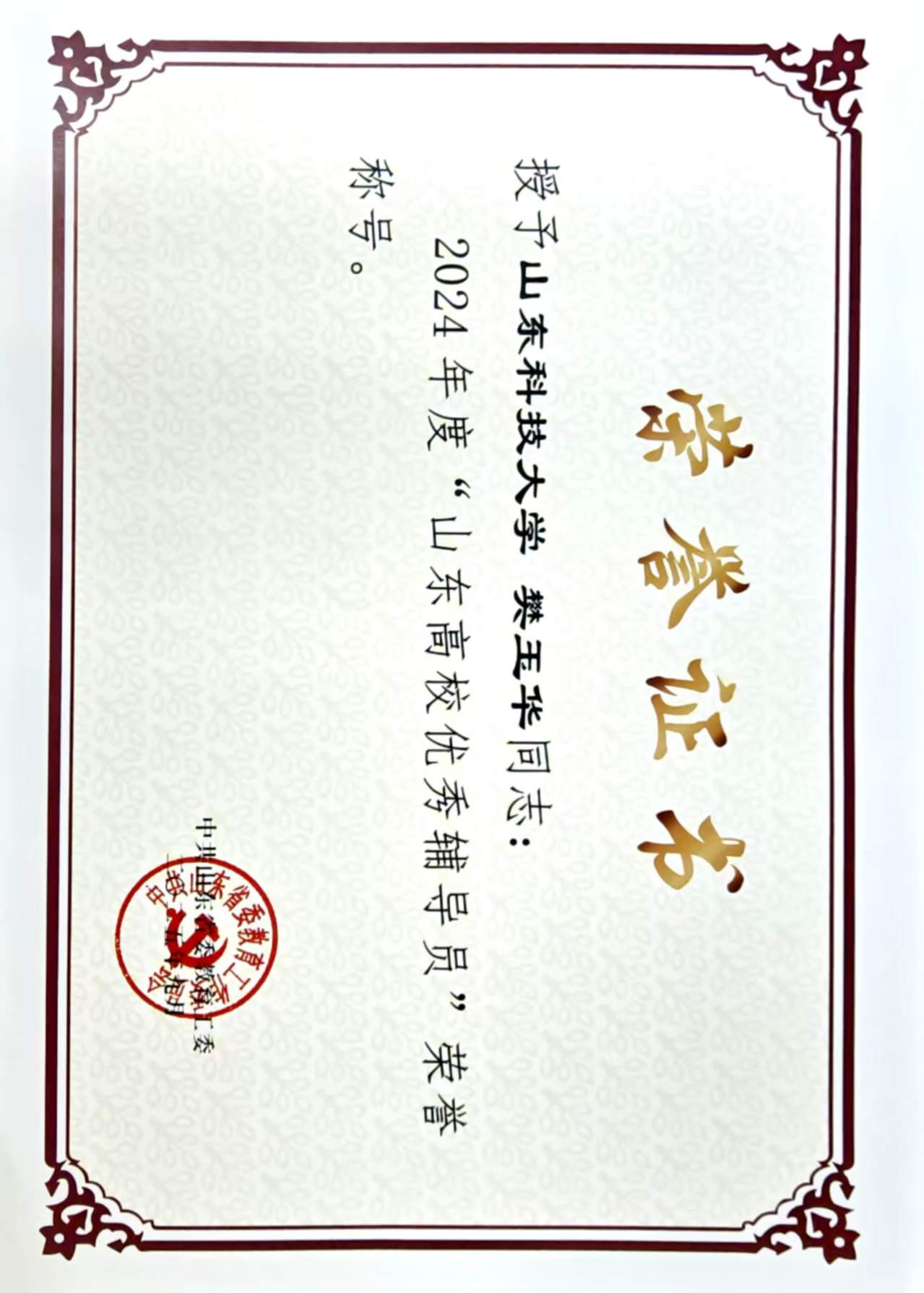 樊玉华获山东省“优秀辅导员”
