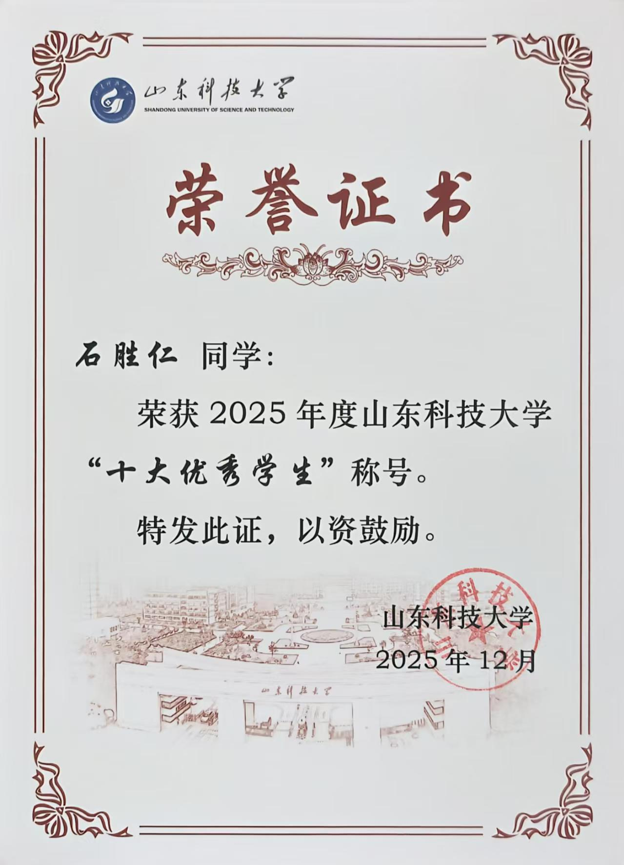 石胜仁同学获评草榴 “十大优秀学生”荣誉称号