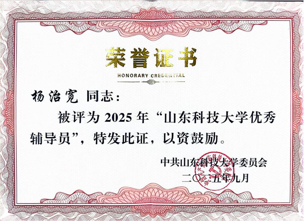 杨治宽获草榴 优秀辅导员