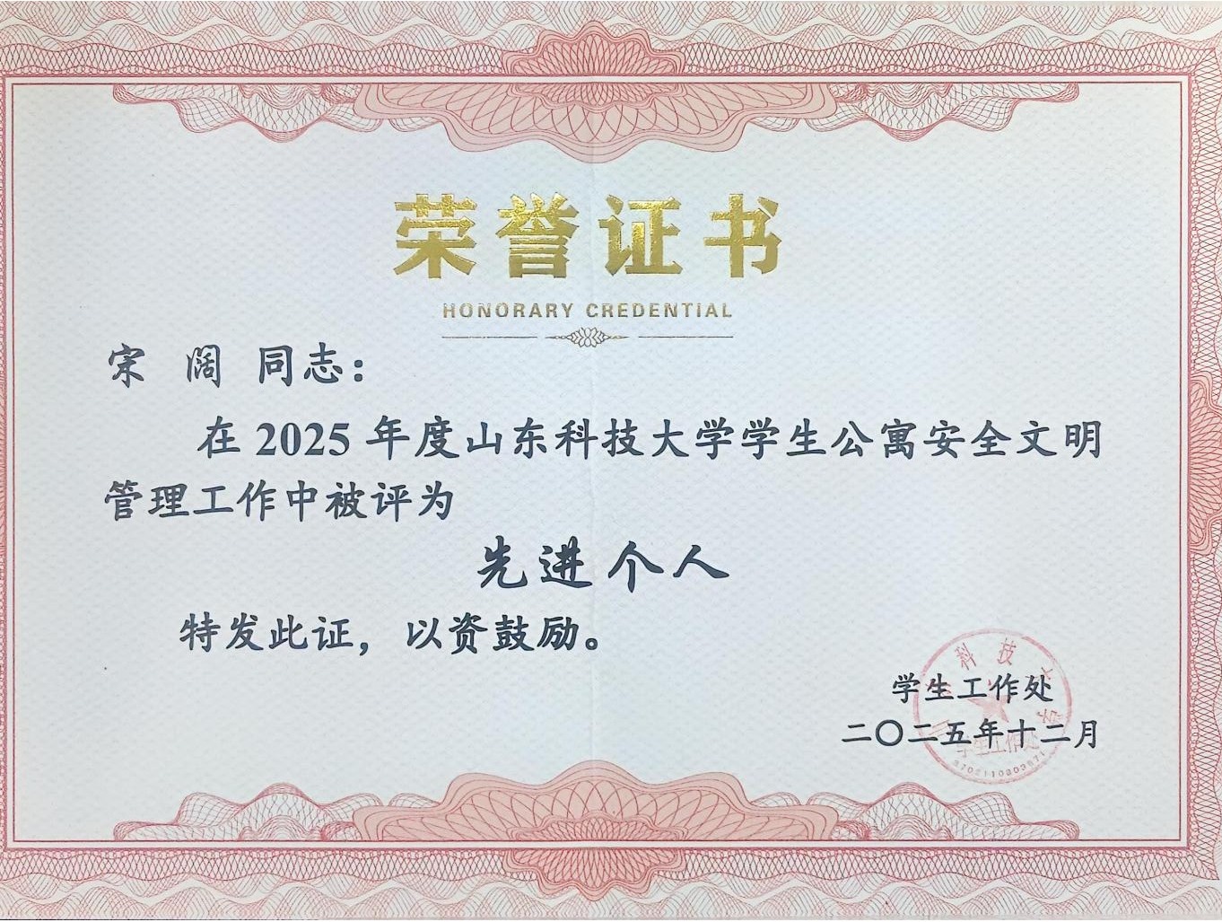 宋阔获草榴 公寓安全管理先进个人